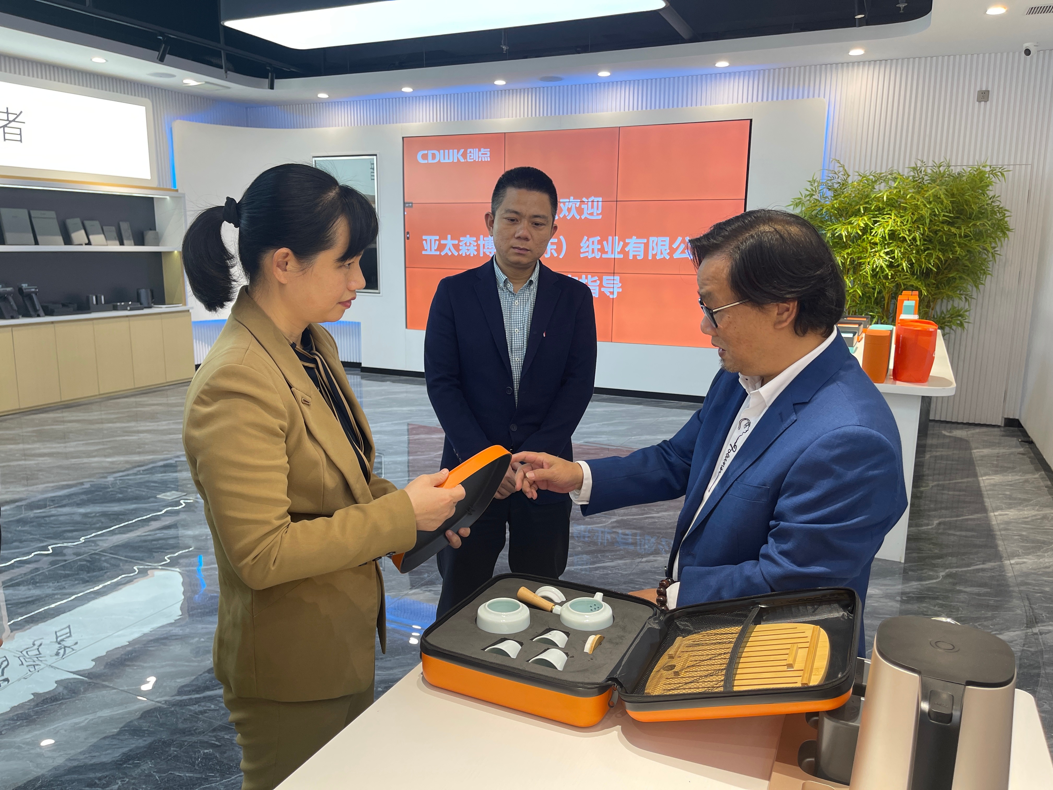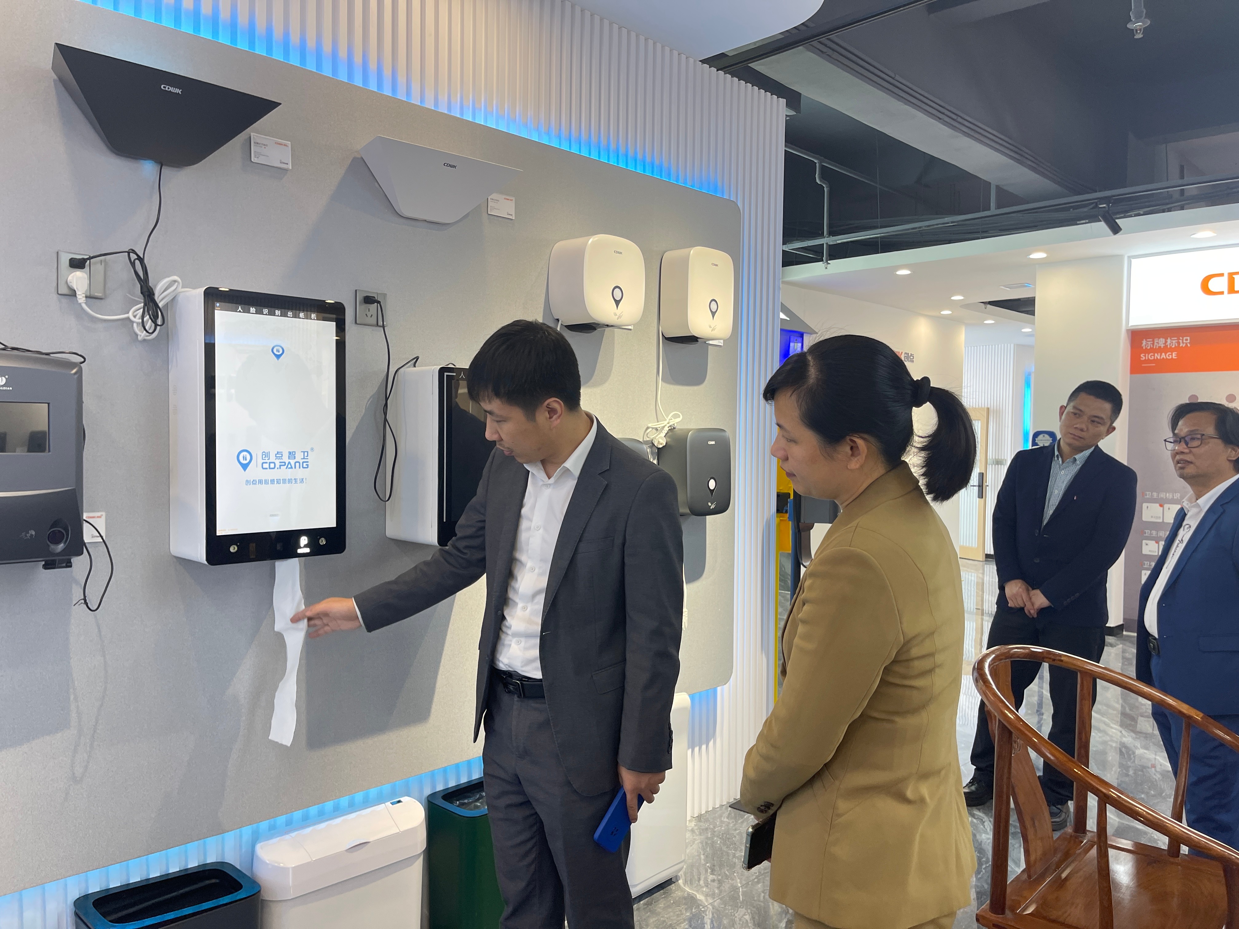 市場總監(jiān)夏總向黃日芳女士展示臉部識別紙巾盒