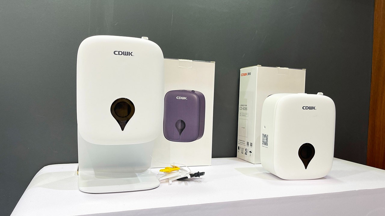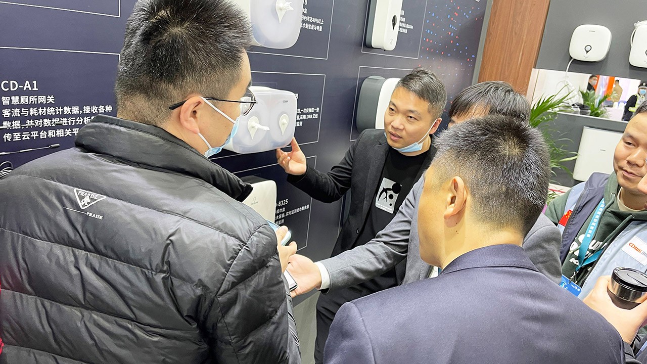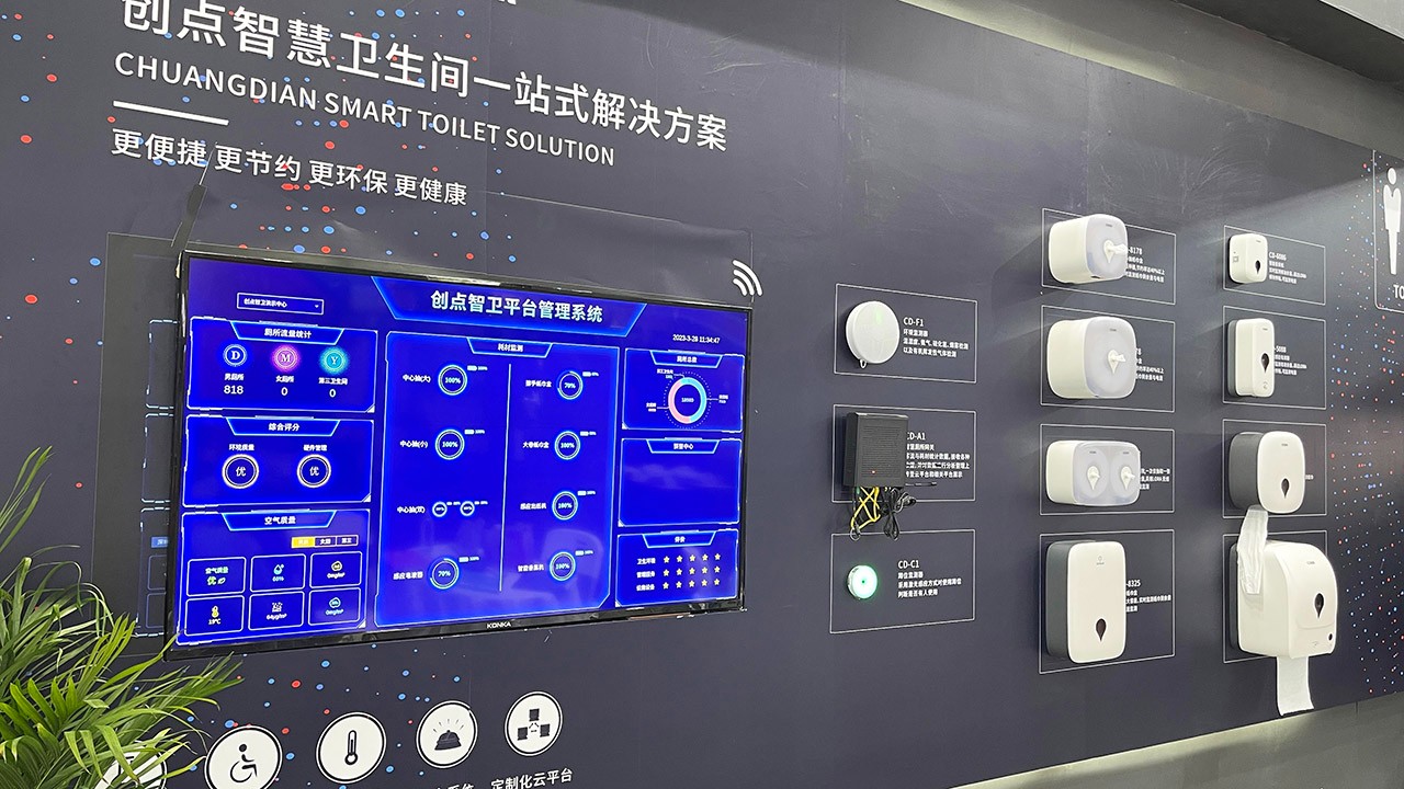 CDWK創點重點展示和平系列公共衛生用品,其包含感應皂液器、公共廁所紙巾盒、公共烘手機、雙卷中心抽擦手紙巾架、垃圾桶、噴香機等產品解決方案,創造更高效、便捷、節能的公共衛生環境,助力城市智能廁所的高質量發展。