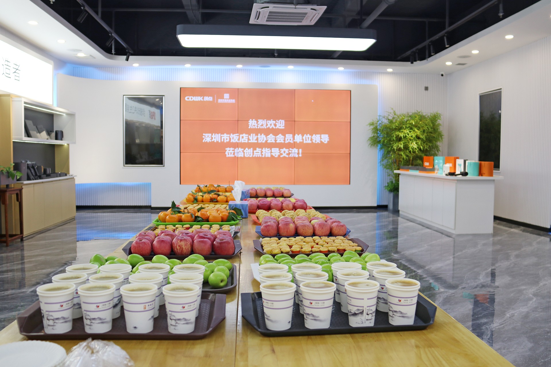 在產品展廳現場,公司給大家準備了豐富的下午茶點,現場人兒一遍享受美食一遍參觀創點產品,各酒店單位的領導對我們展廳的產品有著濃厚的興趣,由公司龐總、楊總、王總、夏總親自向各位領導介紹,大家紛紛對創點的產品表達了高度認可與贊揚,并表示出合作的想法,實現發展共贏。